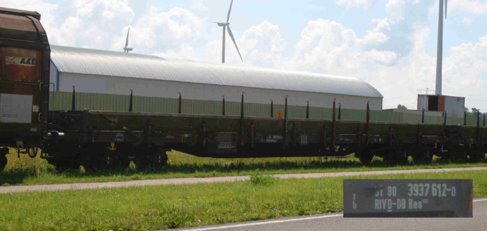 In feite is het een bloktreintje, bestaande uit twee dichte wagens en een stuk of zes platte, type Res. De lettercode staat voor: platte wagens op draaistellen (R), met neerklabare schotten (e), max 100 km (s). |