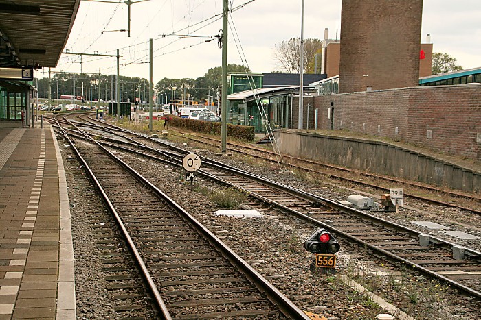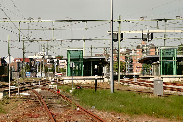 18/10/2010 Treinen passeren de Velsertunnel bovendien met een redelijke snelheid om te voorkomen dat ze daarin blijven steken. De afstand tussen station en tunnel is uiterst kort. Een alternatief was vele jaren kopmaken in Uitgeest, zo'n 10 km noordelijker, maar dat kostte gauw een uur. Wissels zijn verbeterd en het uitloopspoor is verlengd om zoveel mogelijk treinen direct in Beverwijk binnen te kunnen nemen. Alles speelt zich af op het zijspoor hier rechts. |