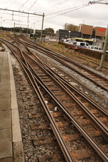 18/10/2010 (foto ri zuid) De sporensituatie bij station Beverwijk is niet handig voor het grote vervoer van en naar Tata Steel. De aansluiting van Tata (hier dubbelspoor rechts) loopt richting zuid, terwijl alle aan- en afvoer ook uit het zuiden door de Velsertunnel gaat (hier links). Elke trein moet m.a.w. kopmaken. In het midden de restanten van opstelsporen en de losweg van Beverwijk. |