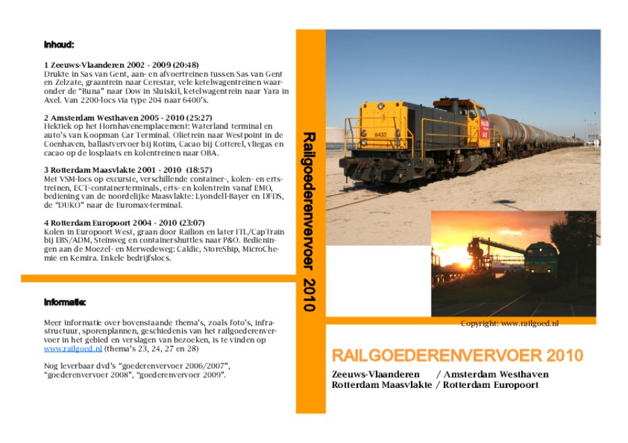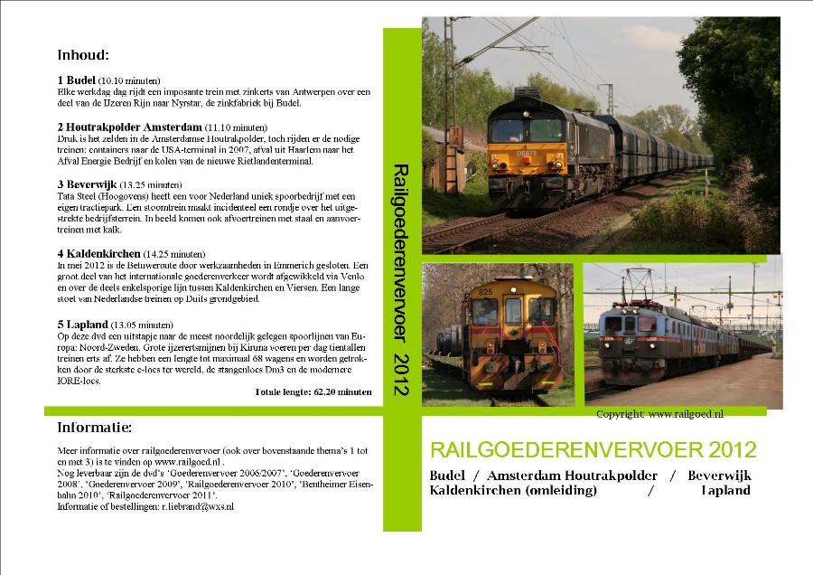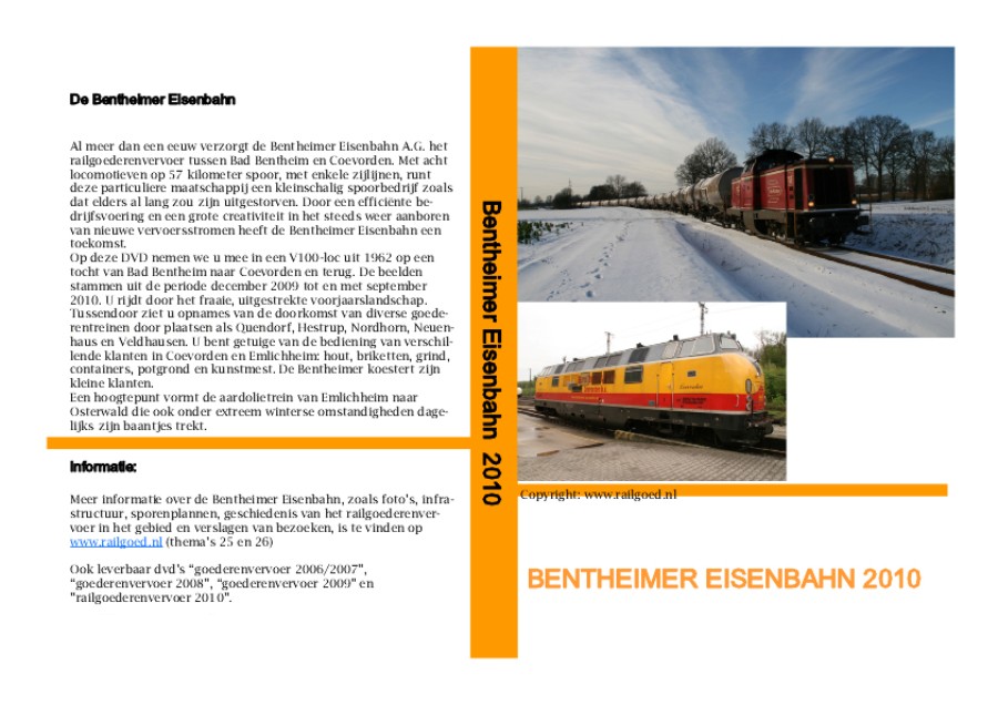 Ook nog leverbaar oudere DVD's voor slechts €12,95: * Railgoederenvervoer 2012 (62 minuten) * Railgoederenvervoer 2011 (90 minuten) * Railgoederenvervoer 2010 (90 minuten) * Bentheimer Eisenbahn 2010 (70 minuten) * Goederenvervoer 2009 (90 minuten) * Goederenvervoer 2008 (90 minuten) * Goederenvervoer 2006/2007 (90 minuten) |
