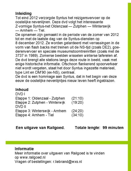 Bestel nu de nieuwste DVD van Railgoed. * Traject 1: Oldenzaal - Tiel (Syntus) voor €19,95 (2 dvd totaal 90 minuten) Prijs is inclusief BTW en verzending binnen Nederland. Gebruik voor je bestelling het contactformulier. |