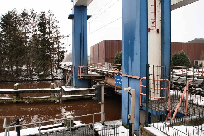 | 23/12/09 Iets beters kon ik er niet van maken. Tussen de linkerzuil van de brug en de bomen is het korte spoortje van Tref te zien, vanwaar regelmatig een wagen potgrond verstuurd wordt |