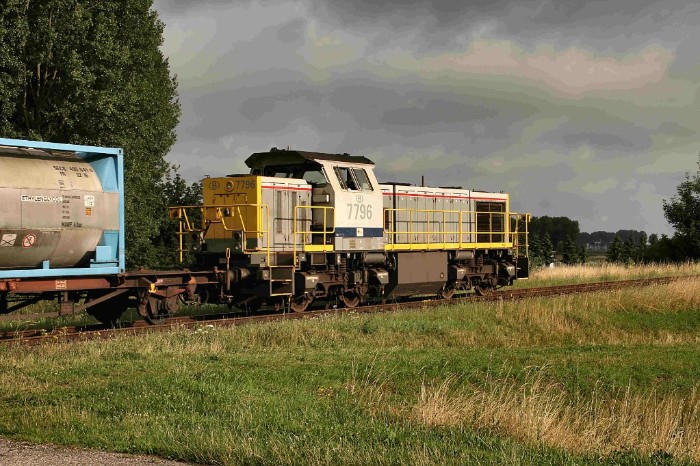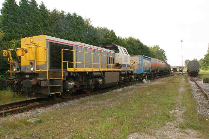 | 20/07/09 De 7796 heeft zich voor de aanvoertrein geplaatst, waar - even heb ik niet opgelet - een tankcontainer vóór geplaatst is. |