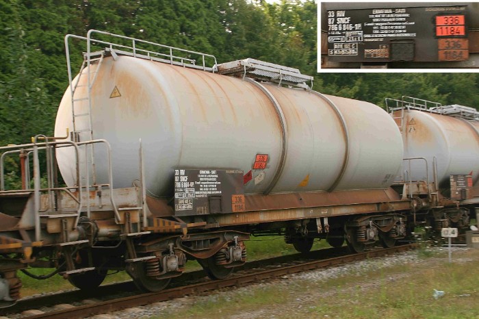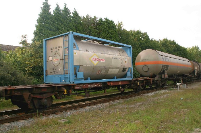 | Achter de tankcontainer hangen nog acht ketelwagens. |