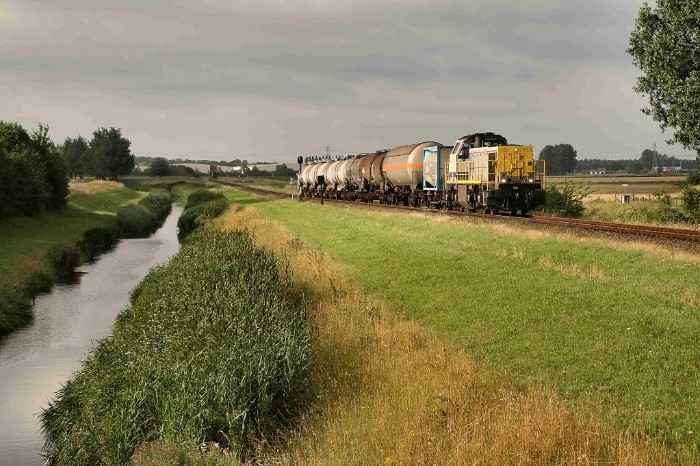 | Door de uiterst lage baanvaksnelheid (30 km) kan ik de trein een eindje verderop, ter hoogte van Sluiskil, nogmaals fotograferen. |