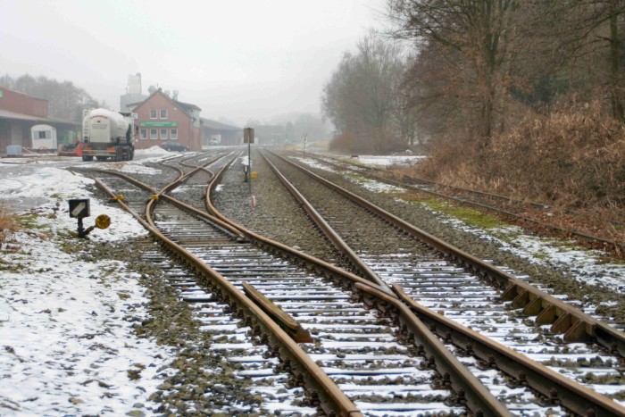 | 18/02/10 Veel stations van de BE hebben nog de uitstraling van de jaren '50-'60, het hoogtepunt van het spoorvervoer. Veldhausen, even ten noordwesten van Neuenhaus, heeft ook alweer een buitenproportioneel emplacement, Vier doorgaande sporen en een lang spoor langs de loodsen. Veel gebruik zal er niet van gemaakt worden. |