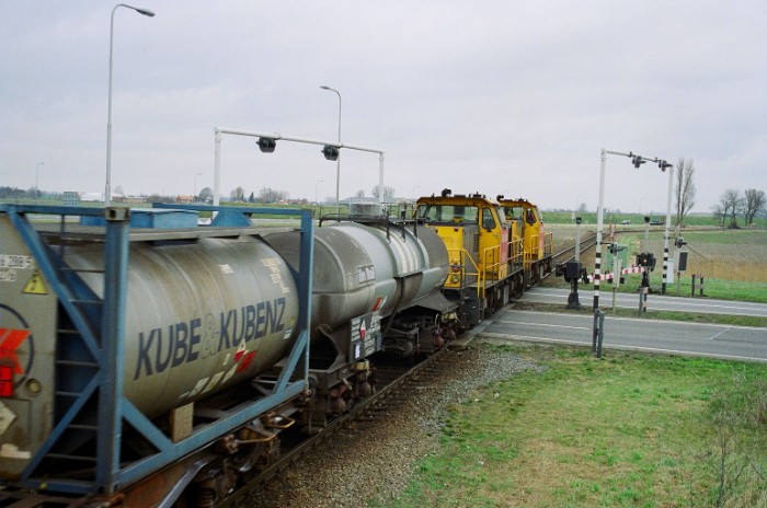De trein bestaat uit een vier fosforketelwagens en een containerdraagwagen van Thermphos… |