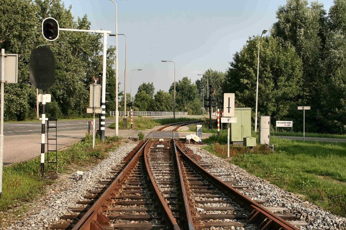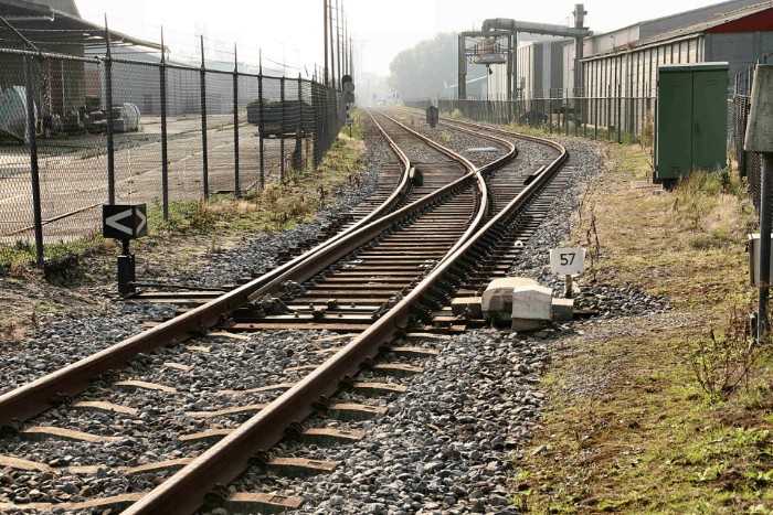 | Rechts begint een omloopspoor; links ligt de poort van een oude goederenloods van Wagenborg. |