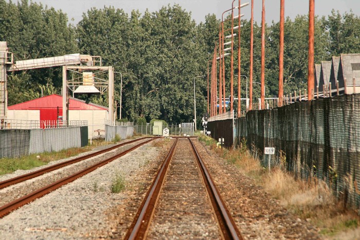 | Foto richting station. Rechts Wagenborg; links lag in het verleden ook een aansluiting. Voor de goede kijker: door de uitsparing in het hek is nog juist een stootjuk zichtbaar. |