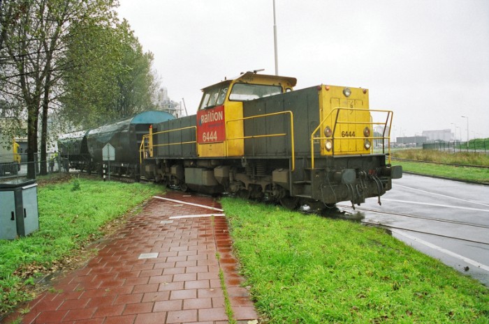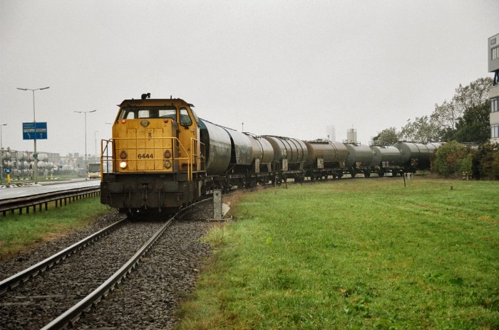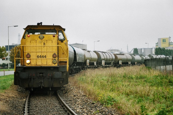 | 21/10/2005 Uit de tijd dat Carbon Black nog bediend werd. Railion 6444 duwt een rangeerdeel de Welplaatweg op, bestaande uit twee bulkwagens voor Carbon Black en verder ketelwagens voor Vopak. |