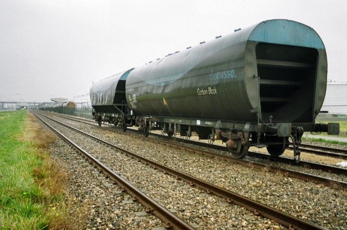 | Met de twee lege wagens achterop worden twee met roet beladen wagen weggetrokken bij Carbon Black. |