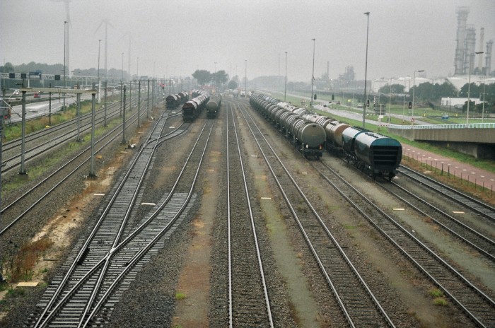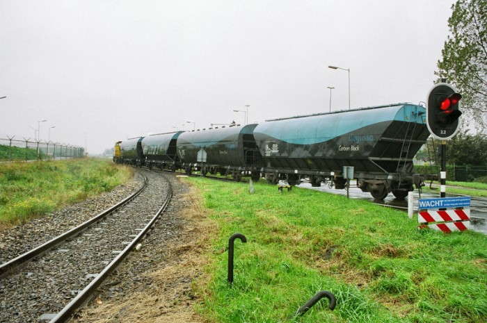 | De twee blauwe Degussawagens blijven achter op een omloopspoor (in de verte ligt het RCC) terwijl de ploeg de ketelwagens bij Vopak plaatst. |