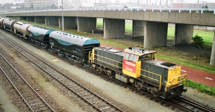 | Eerder die ochtend is het rangeerdeel voor de Botlekweg/Gerbrandyweg op het emplacement samengesteld. Onder: de 6444 begint zijn tocht naar o.a. Carbon Black. |