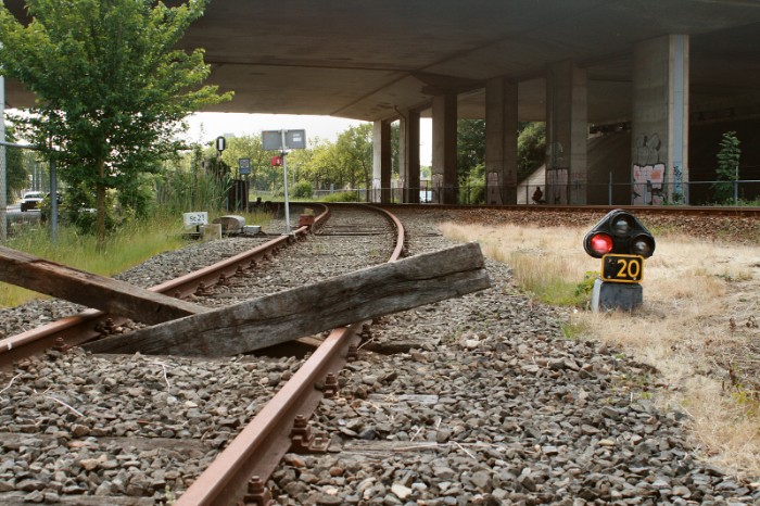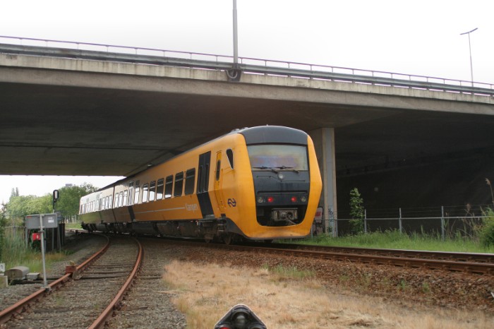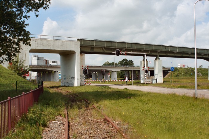 Onder de A28 sluit de stamlijn aan op de spoorlijn naar Kampen. Een dwergsein markeert de grens tussen geïsoleerd en ongeïsoleerd spoor. Waarschijnlijk vanwege de afbraakwerkzaamheden is de lijn tijdelijk gesloten. In het voorjaar van 2011 rijden er weer treinen met sloopmaterieel naar de haven. |