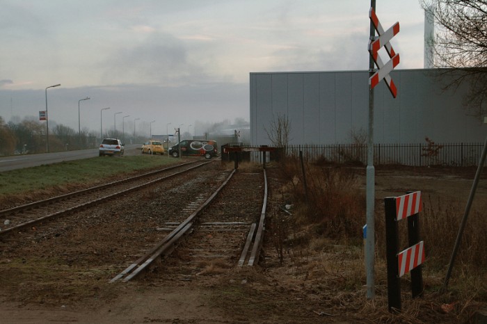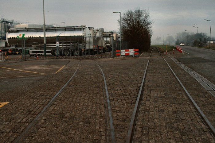 | Het spoor loopt rakelings langs de bedrijfsgebouwen van Unimills, dat twee aansluitingen heeft gekend. De tweede (foto onder) eindigt onder een grindlaag van een parkeerplaats. |