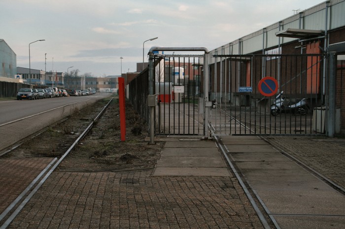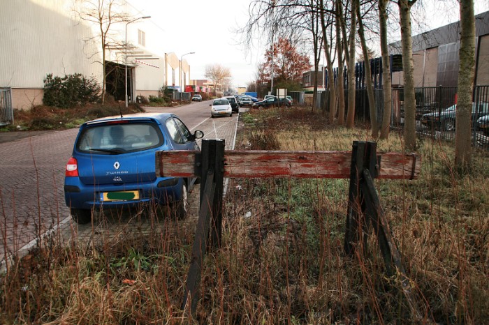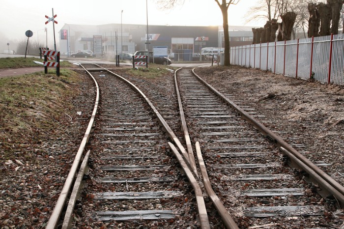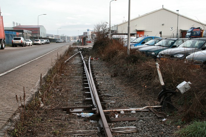 | Iets verderop takt nog een lijn af naar de Merwedeweg; de aansluiting met de stamlijn is al verwijderd, het spoor verdwijnt langzaam onder het groen. |